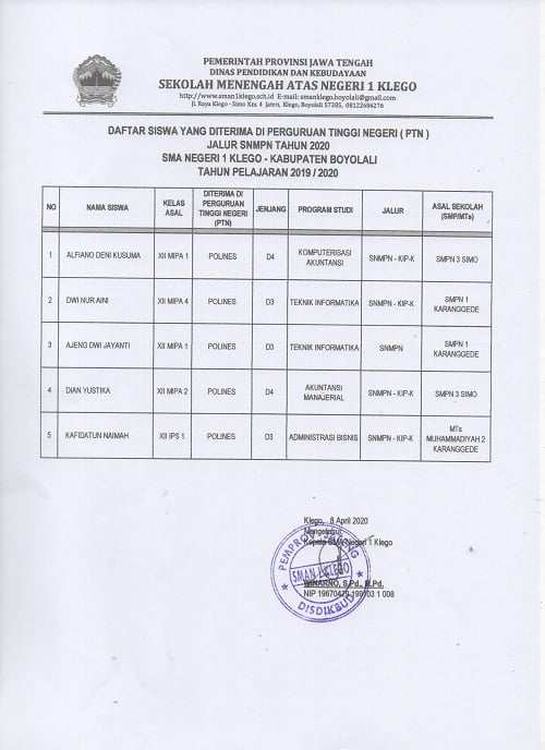 Daftar Siswa yang Diterima PTN Jalur SNMPN TAHUN 2020
