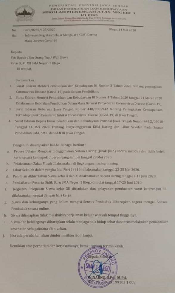 You are here: Official Website SMA Negeri 1 Klego > Berita > Informasi Perpanjangan Kegiatan Belajar Mengajar (KBM) Daring dan Kegiatan Sekolah lainnya Masa Darurat Covid- 19