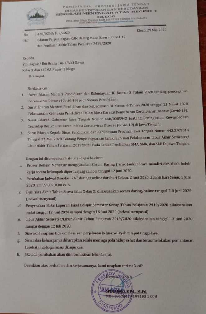 Edaran Perpanjang KBM Daring dan PAT Tahun Pelajaran 2019/2020