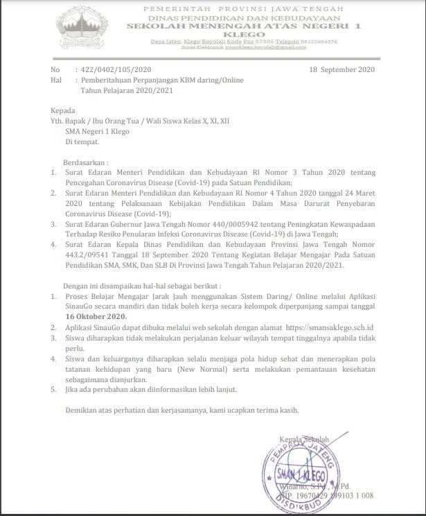Edaran Pemberitahuan Perpanjangan KBM Daring/Online Tahun Pelajaran 2020/2021