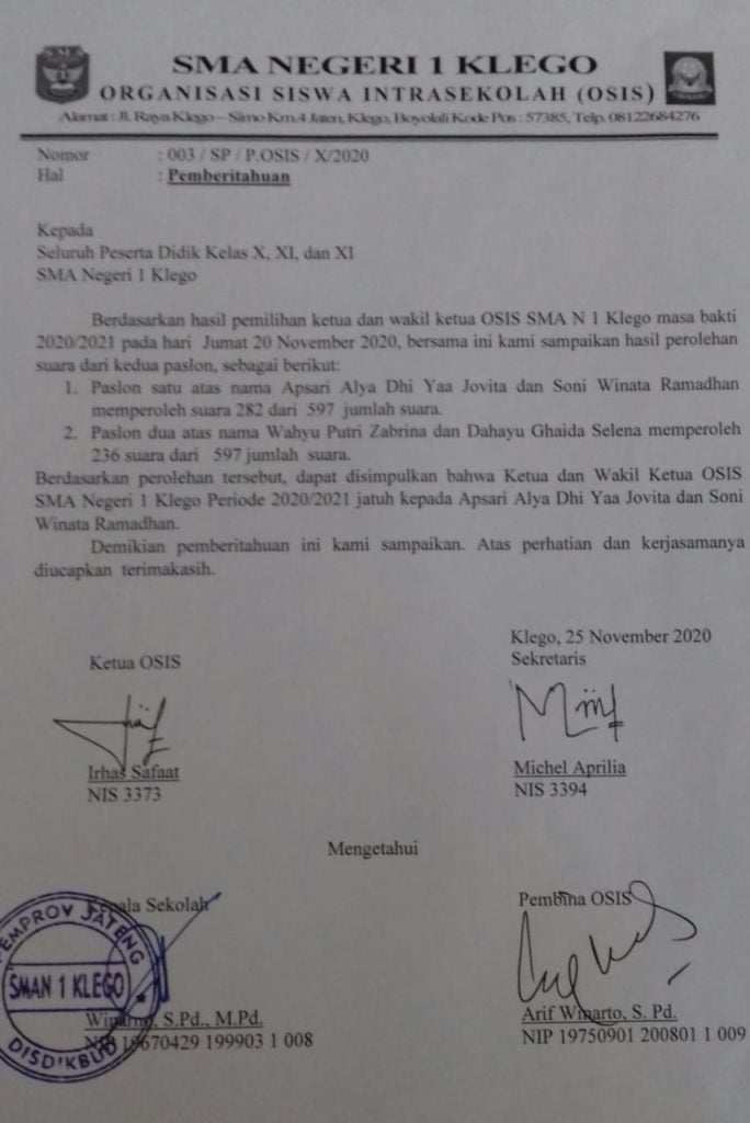 Hasil Pemilihan Ketua OSIS secara Online Periode 2020/2021