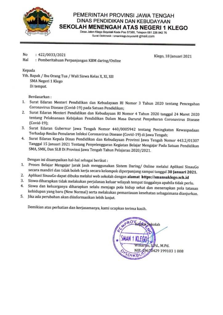 Pemberitahuan Pelaksanaan Pembelajaran Daring Semester Genap Tahun Pelajaran 2020/2021