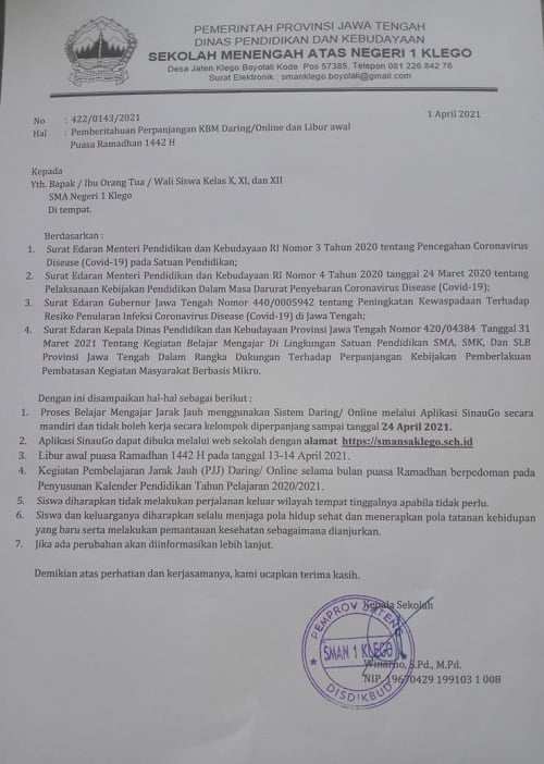 Pemberitahuan Perpanjangan KBM Daring/Online dan Libur Awal Puasa Ramadhan 1442H