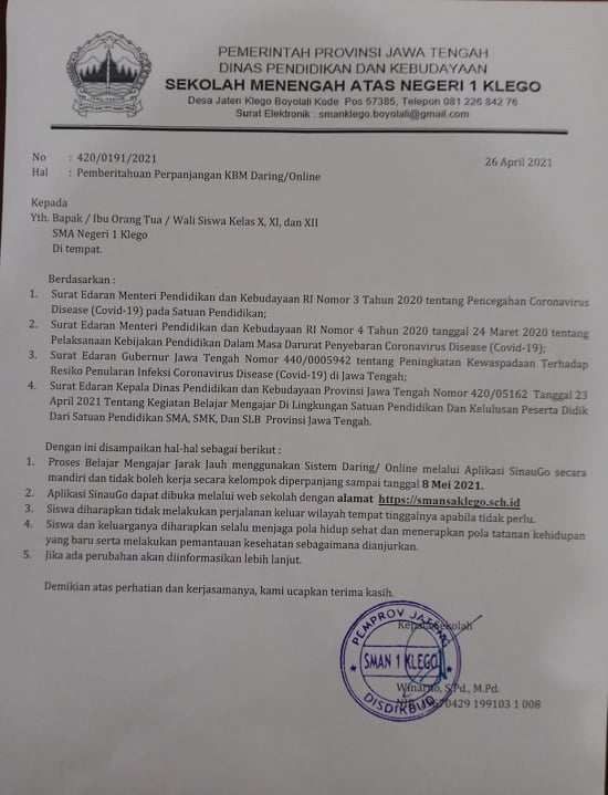 Pemberitahuan Perpanjangan KBM Daring/Online