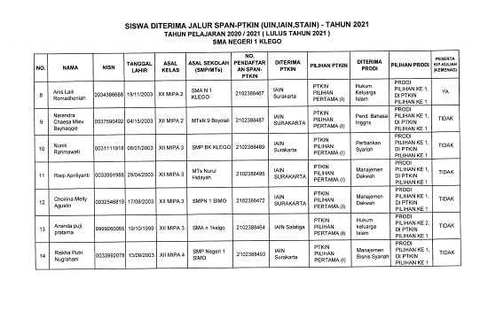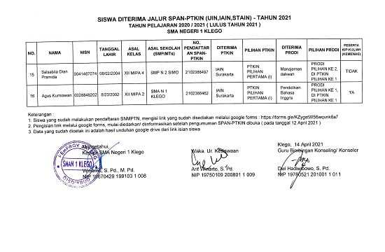 Data Siswa Diterima Jalur SPAN PTKIN Tahun 2021